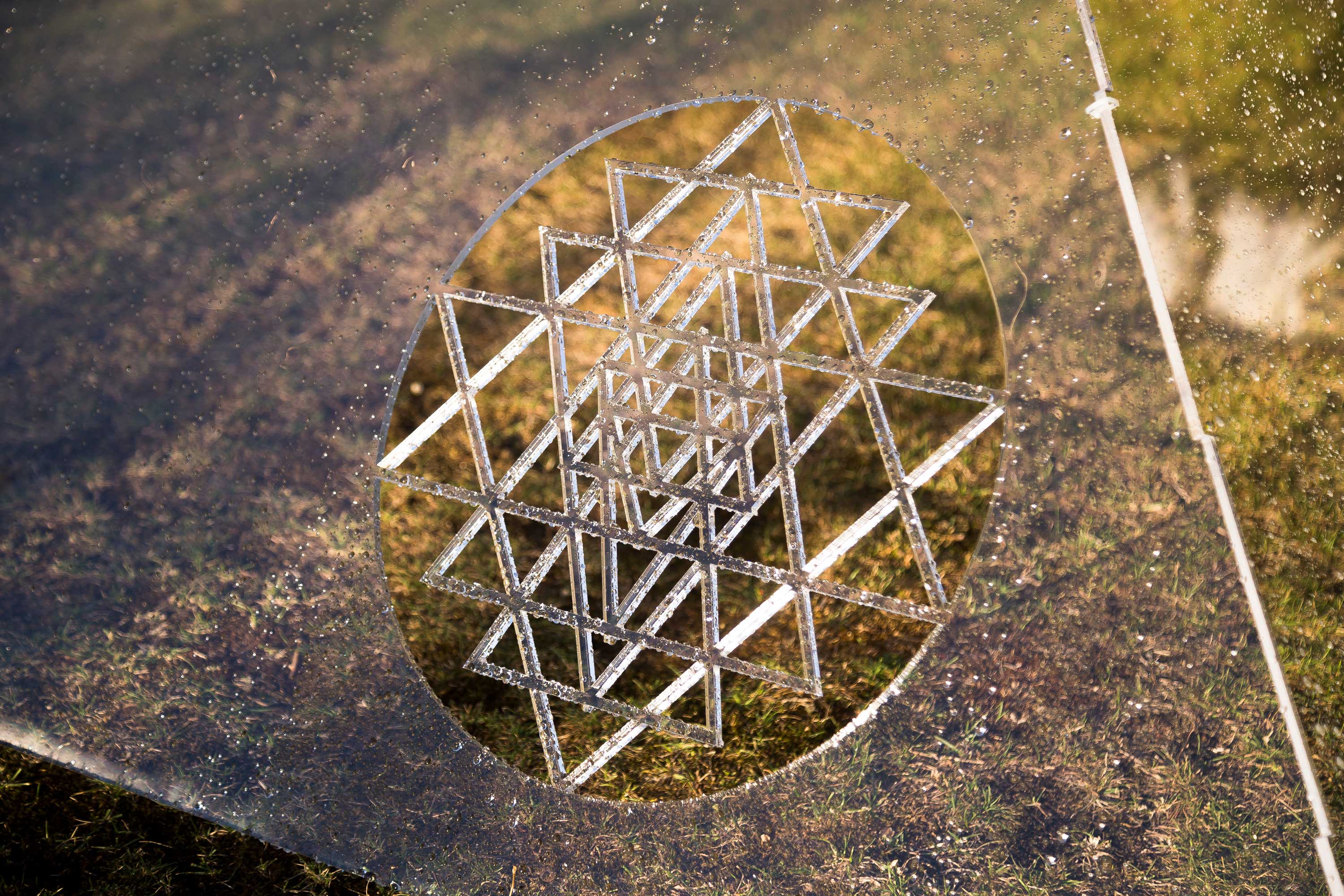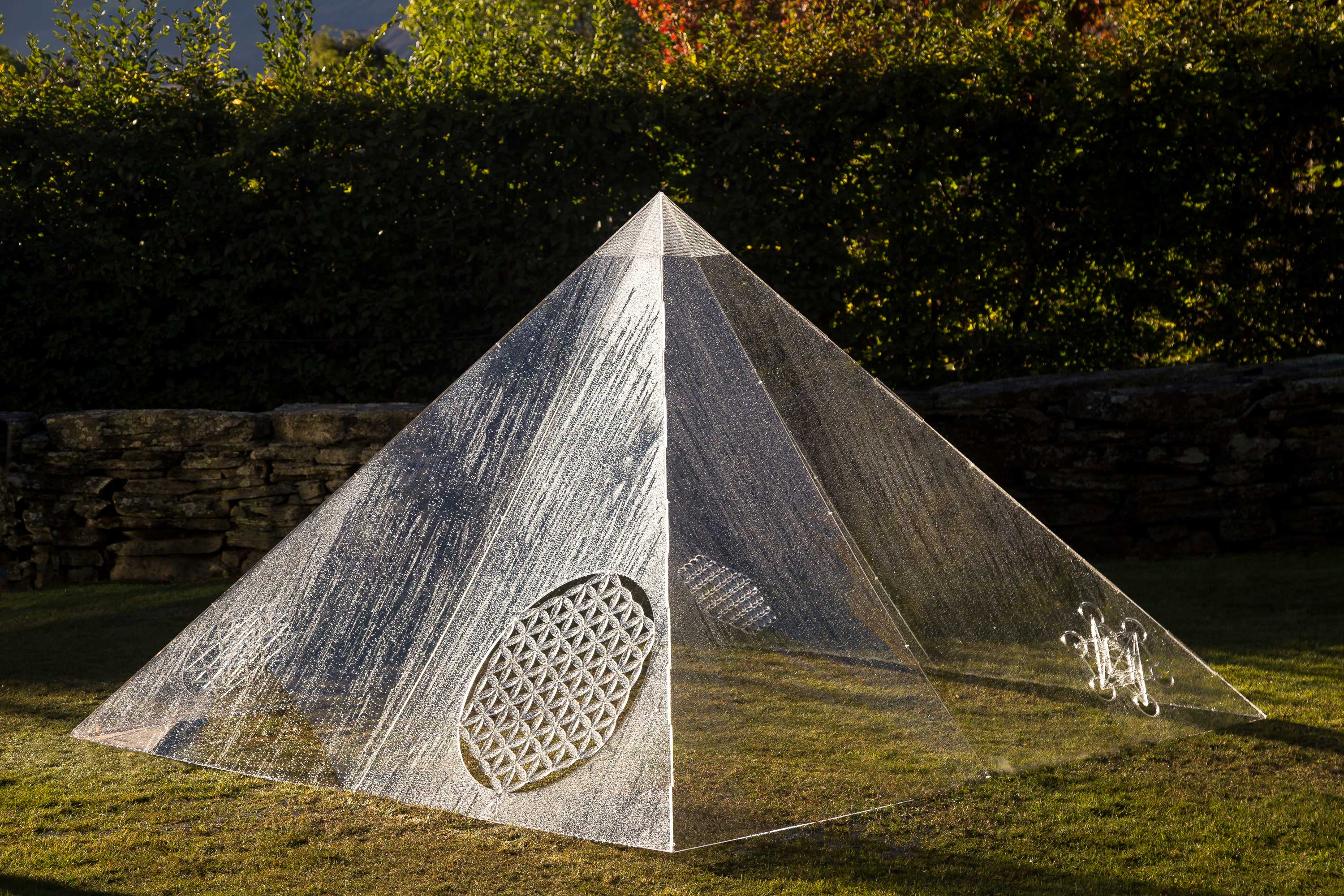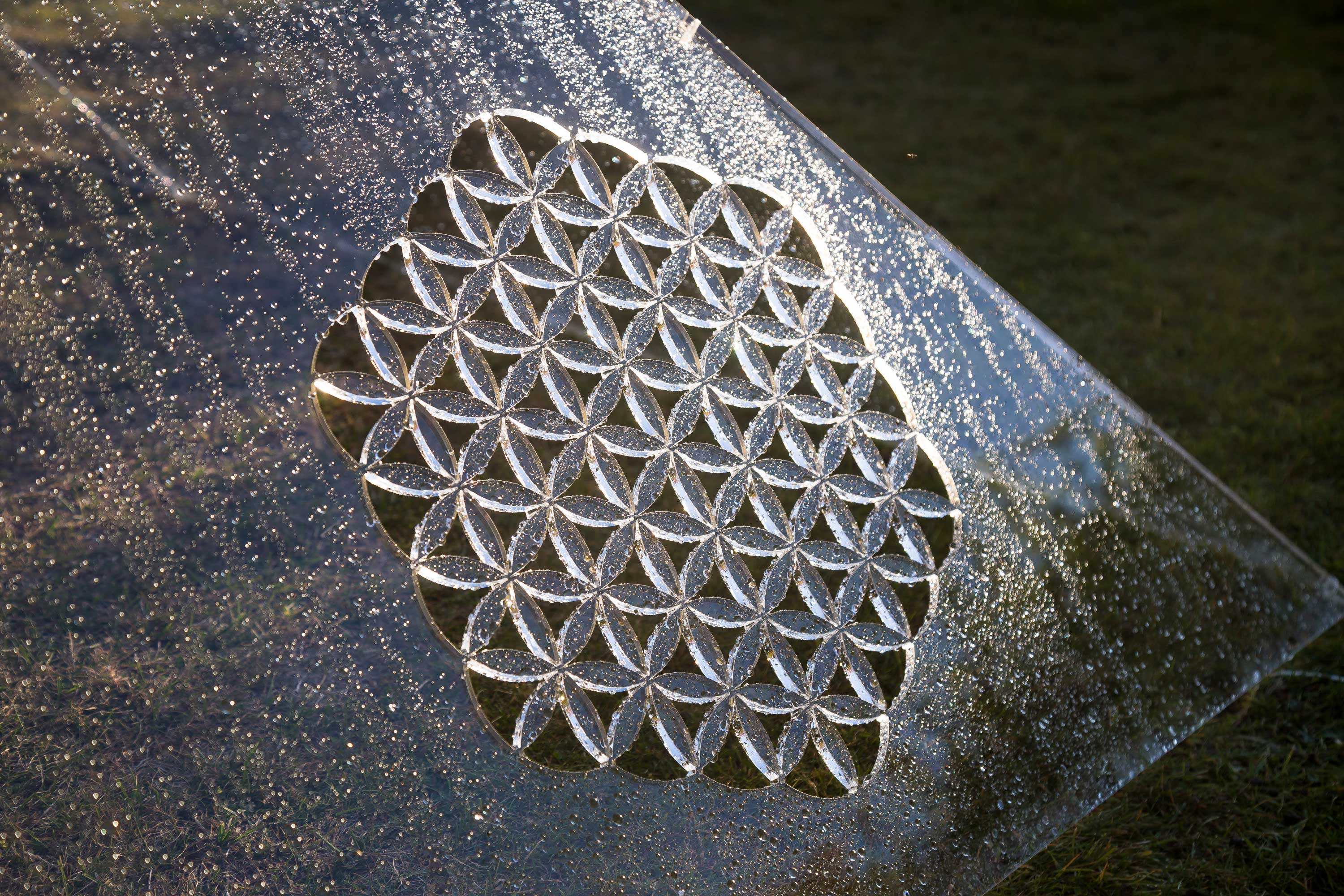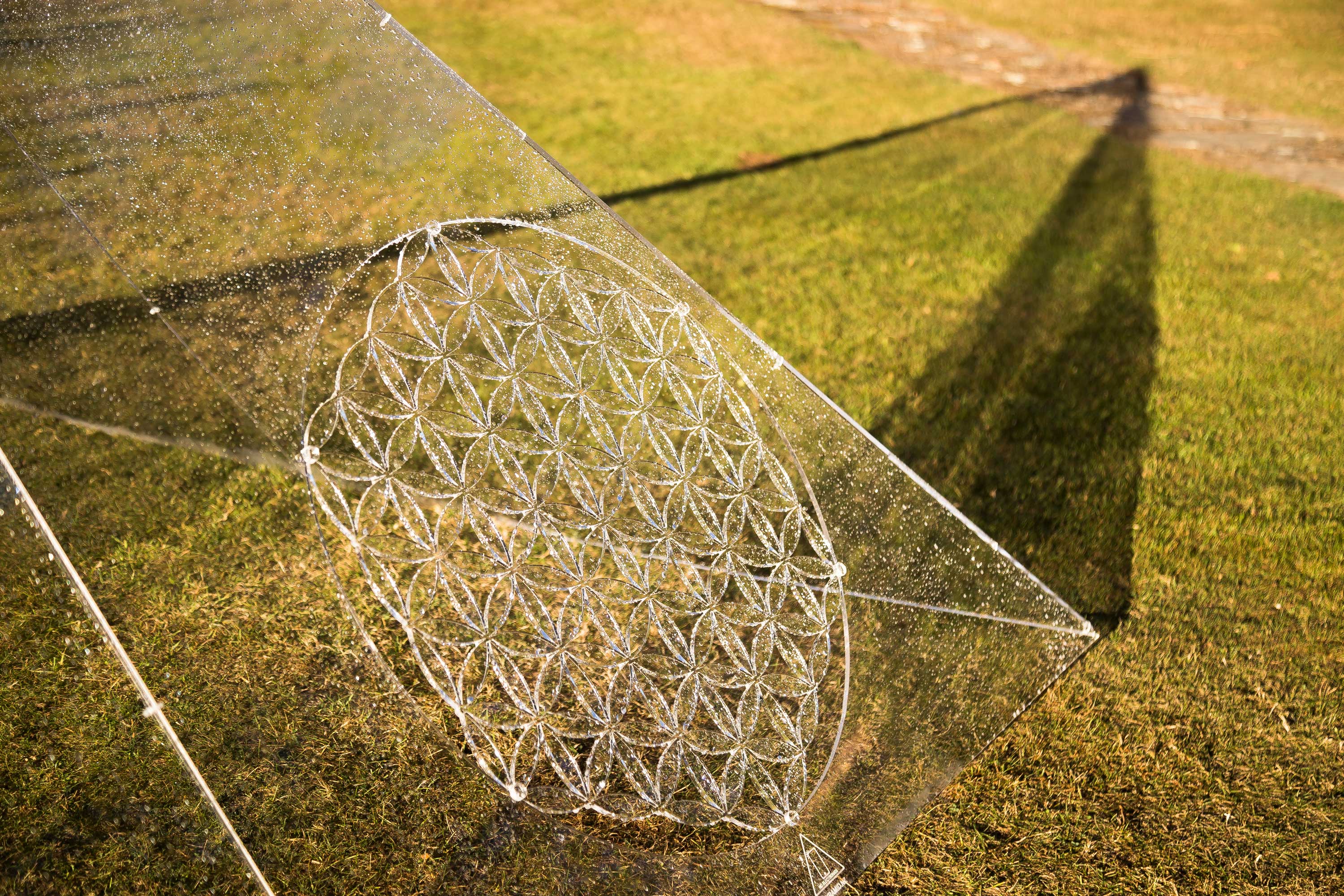 Carefully tuned to 432Hz, the precise angles of the great pyramid are slowly laser cut through UV proof acrylic glass.